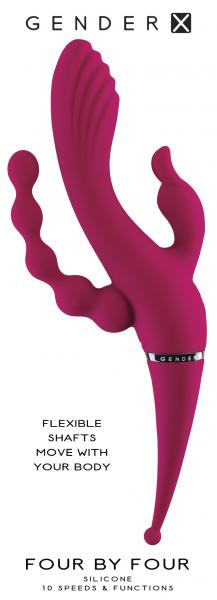 Gender X Four By Four Vibrator from Evolved Novelties. This remarkable vibrator has four points of stimulation in just under 10 inches! The center shaft features two playable ends: a gently curved side with a bulbous textured tip, and a thin, pointy round ball end for targeted stimulation. Emerging from either side are two more stimulators a hard working rabbit with buzzing ears and a chunky head, and a thin, curved beaded shaft that flexes easily to move with your body. A 2 button control panel engages 3 motors at once, with a separate button for the round tip pointer. Find out what fantasies this quadruple stimulation toy can bring to life with its abundant possibilities! Completely rechargeable, water submersible and easy to clean. Specifications: quadruple stimulation vibrator. Textured, curved center shaft with bulbous textured tip. Beaded, curved shaft stimulator. Chunky rabbit ear stimulator. Pointy round tipped shaft at other end of center shaft. Flexible shafts move with your body. Center shaft, rabbit and beaded stimulator each have their own motor, controlled together. 10 vibrating speeds and functions. Vibrating pointed ball end controlled separately. 10 vibrating speeds and functions in pointed shaft. Easy to use 2 button control panel under rabbit stimulator. Light emitting diode LED illuminates buttons when in use. Size height 10.83 inches, depth 3.86 inches, width 1.54 inches. 4.75 inches insertable shaft. Weight: under .5 a half pound. Made from creamy smooth Silicone. Detail made from black chrome finished ABS plastic. Waterproof vibrations. Submersible into water. Body safe, phthalate free and latex free. Magnetic rechargeable, USB cable included. Categories: Rabbit Style Vibrators, Rechargeable Vibrators, Sex Toys for Women, G-Spot Rabbit Style Vibrator. 2022.