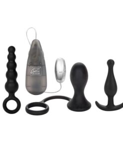 Zero Tolerance Intro To Prostate Kit Black. Unlock the secret pleasures of prostate play with this kit that moves from beginner to advanced with every stimulating stage in between. Four satin soft toys in luxurious silicone progress from gentle bulbs and beads with hands free suction cups to erotic cock ring and prostate combination play. Evolve your way to the most advanced toy, which vibrates to add an intensity that leads to mind blowing orgasms. The Dr. Ava’s Guide to Prostate Play Download will teach you everything you need to know along the way, and all the toys are fully waterproof and submersible, so have fun in the bath or shower! Clean up is easy with Zero Tolerance toy cleaner and hot water rinse.