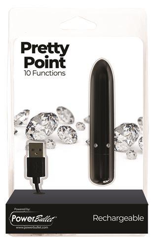 Power Bullet Pretty Point 4 inches 10 Function Bullet Vibrator Black from BSM Enterprise. The Pretty Point bullet vibrator is not just a pretty face, it comes with some serious power. Enjoy up to 10 unique functions paired with PowerBullets world famous deep and rumbly vibrations that go from mild to wild. A pretty girls best friend is a lux inspired bullet vibe accented with crystals for those who are looking for a little glamorous touch, no pun intended. At an incredible value, PowerBullet has put an exciting twist to the classic bullet shape and added a pointed end, so that the vibrations can travel directly where you want them to go with pinpoint accuracy. This compact toy is perfect for on the go adventures and can fit right in your purse, just treat it like it is one of your lipsticks! And you do not have to worry about the vibrations randomly going off, the Pretty Point is equipped with a travel lock feature that ensures discreet travel. For play off of dry land, bring the Pretty Point into the bath tub or shower, it is waterproof! Virtually seamless, the smooth finish band deep shine to the bullet are nice to feel and look at, but also have body safe advantages that allow you to use it on all your most delicate areas. Key features: Bejeweled bullet vibrator. Pointed tip for targeted pleasure. 10 functions. Power Bullet Motor. Body safe material. Compact size. Travel lock. Easy to use. Waterproof vibrations. USB Rechargeable. Dimensions: length 4 inches. Insertable length 2.3 inches. Width 0.5 inch. Diameter 0.7 inch. Body safe materials ABS plastic and silicone.