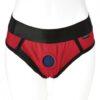 Features jock style. Interior fabric panels secure toys and provide support. Built in nitrile o-ring 1.5 inches. Designed with 2 bullet pockets to provide extra stimulation. Please note bullet vibrators are not included. Material wicks away moisture and keeps it under control. Includes a travel pouch to carry your harness anywhere with ease. Color Red, Blue.